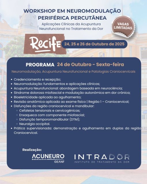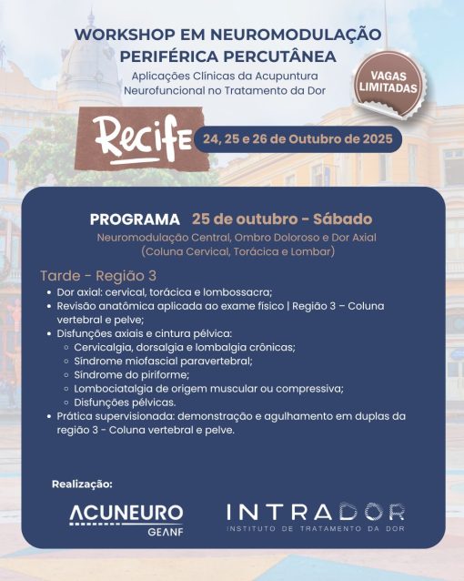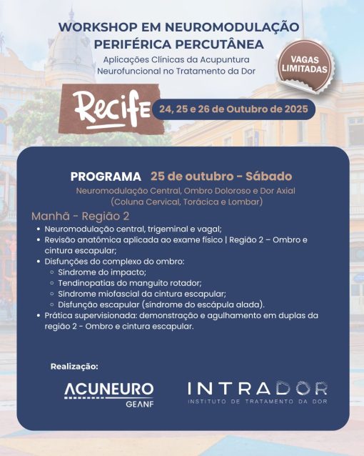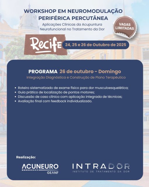 Objetivo: Capacitar o médico a realizar neuromodulação periférica por meio de agulhamento direcionado, com base em evidências neurofisiológicas e aplicação prática nas principais patologias de dor musculoesquelética e disfunção neuromotora.